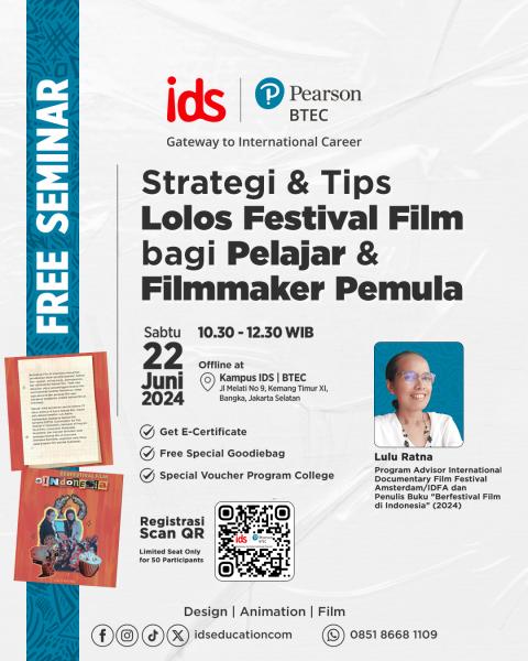 Buat kamu yang penasaran yuk ikutan seminar IDS | BTEC kali ini bersama Lulu Ratna – Program Advisor International Documentary Film Festival Amsterdam/IDFA dan Penulis Buku “Berfestival Film di Indonesia” (2024). Webinar ini akan membahas tentang strategi dan tips agar lolos festival bagi pelajar dan filmmaker pemula.